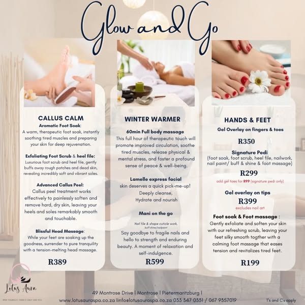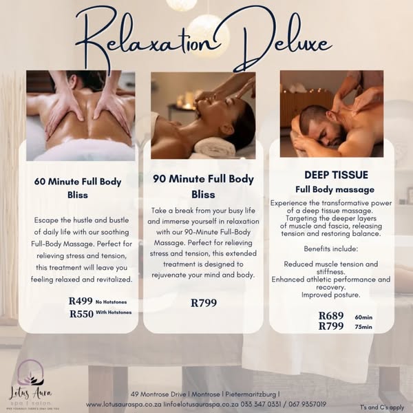 搜索关键词 spa specials, July spa deals, relaxation massage, Lotus Aura Spa, Pietermaritzburg spa, winter spa escape, beauty treatments, rejuvenating spa, stress relief, massage therapy优势 Relaxation and rejuvenation,Special offers and discounts,Warm escape from cold weather