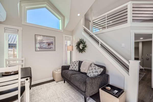 This move-in-ready fully electric ~399 sf park model features 1 bed / ¾ bath, an open floor plan with stainless-steel appliances, in-unit laundry hook ups, ample storage, and a private bedroom with generous closet space. A low-ceiling loft provides extra sleeping or storage space, and each home includes a covered front porch.