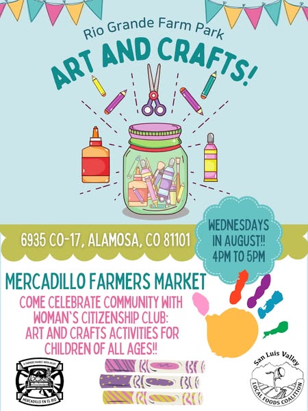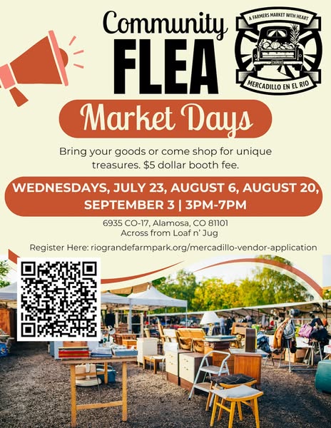 搜索关键词 community market, local events, arts and crafts, open mic night, flea market, Rio Grande Farm Park, local food, community gathering, family friendly, Alamosa Colorado优势 Supports local talent and creativity,Offers diverse activities (Open Mic, Arts & Crafts, Flea Market),Provides a relaxing and shaded atmosphere,Features local food and refreshing drinks,Affordable booth fee for vendors
