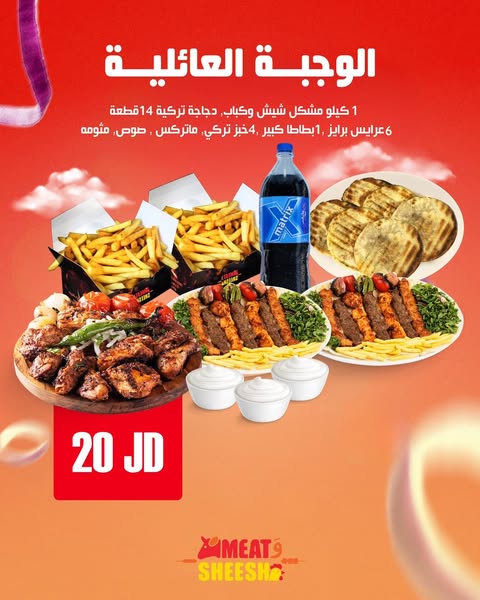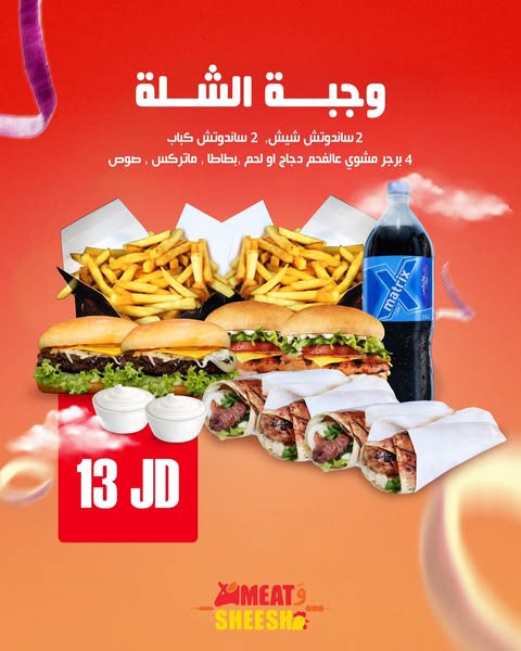 📌عرض وجبة الشلة : ( 2 ساندويش شيش + 2 ساندويش كباب + 4 ساندويش برجر ع الفحم دجاج او لحم + 2 بطاطا + مشروب غازي + مثومه ) بسعر 13 دينار فقط .