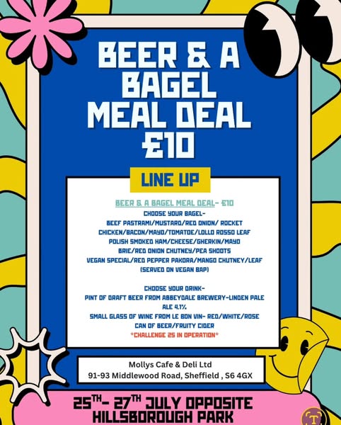 搜索关键词 beer and bagel, tramlines festival, meal deal sheffield, abbeydale brewery, affordable food, festival food, local business, middlewood road, cheap drinks, breakfast butties优势 Affordable price (£10),Variety of bagel and drink options,Convenient location opposite Tramlines entrance,Supports local brewery (Abbeydale Beers),Offers breakfast and other options besides the meal deal