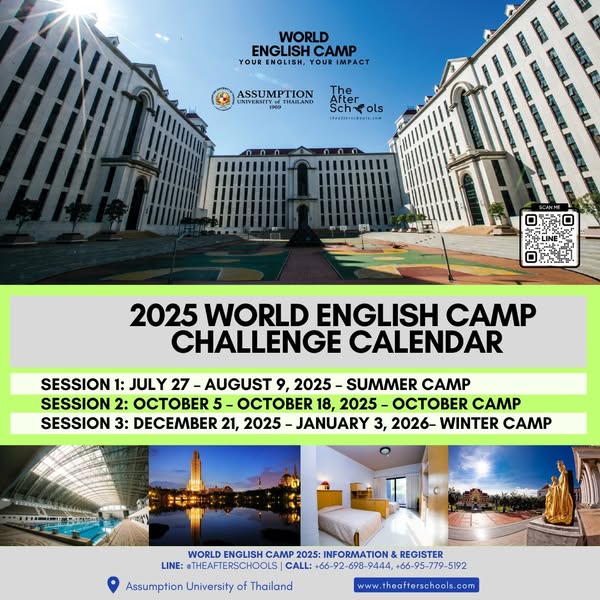 ✨ World English Camp 2025 is now open! Build your English confidence and make international friends over 14 days and 13 nights, packed with activities like tennis, golf, basketball, swimming, skateboarding, inline skating, plus exciting off-campus excursions! Held at Assumption University Suvarnabhumi Campus (Bangna) — all skills combined in one incredible camp!
