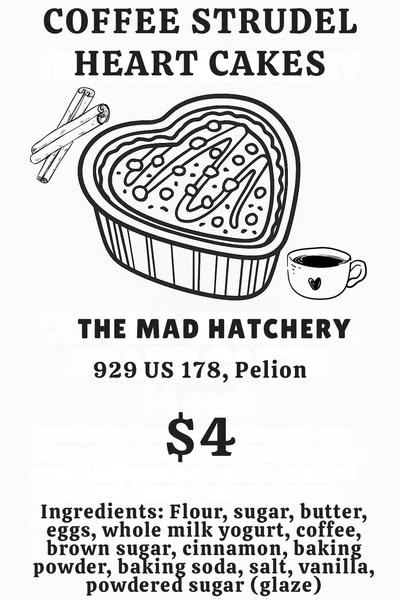 搜索关键词 local farm stand, fresh baked goods, handmade crafts, mental health awareness, suicide prevention, eggs and bread, community event, South Carolina farm, The Mad Hatchery, sweet treats优势 Freshly baked and handmade products,Supports local community and mental health awareness,Unique and diverse product selection