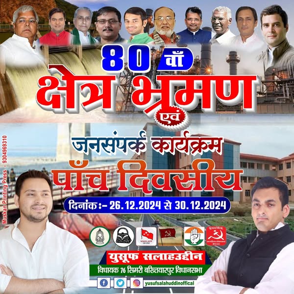 अपने पांच दिवसीय विधानसभा क्षेत्र सिमरी बख्तियारपुर दौरे के तीसरे दिन आज ड्योढ़ी स्थित निवास स्थान में सैकड़ों कार्यकर्ताओं से मिलकर उनके समस्याओं के निवारण के उपरांत अपनी पार्टी राष्ट्रीय जनता दल के सदस्यता अभियान को मजबूती प्रदान किया। पार्टी में अटूट निष्ठा रखते हुए हर परिस्थिति में पार्टी के साथ मजबूती से खड़ा रहा और भविष्य में भी पार्टी को सर्वोच्च शिखर पर पहुंचाने का संकल्प दोहराता हूं।