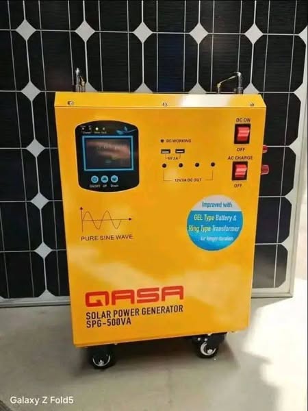 GET THE NEWLY INVENTED QASA SPG 500va SOLAR POWER GENERATOR WITH 2 GAINT SOLAR PANEL 800WATT AND 4 EXTRA INVERTER BATTERY. IT ALSO HAS IT'S OWN INBUILT 12VOLT 5,000ARMS LITHIUM ION BATTERY INSIDE THE INVERTER SOLAR POWER GENERATOR. THE SOLAR PANEL IS USED FOR CHARGING, AND ALSO HAS AN OUTPUT WHERE YOU CAN ALSO CHARGE IT WITH ELECTRICITY (NEPA LIGHT). ONCE IT IS FULLY CHARGED YOU CAN USE IT FOR 2 TO 3 DAYS STRAIGHT AND IT WILL SERVE YOU LIGHT 24HRS EVERY DAY. IT CHARGES ITSELF AUTOMATICALLY WHENEVER THERE IS SUNLIGHT.
