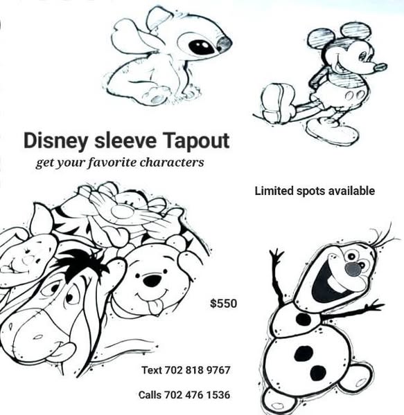 搜索关键词 Tattoo services, Disney tattoos, Walk in tattoos, affordable tattoos, Custom tattoo design, Tattoo promotion, Ozzy tattoos, Tapout tattoos, Cash only tattoos, Tattoo deals优势 Disney and themed designs,Walk-ins welcome,Large designs get priority