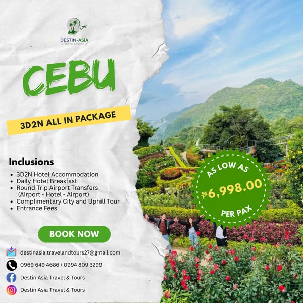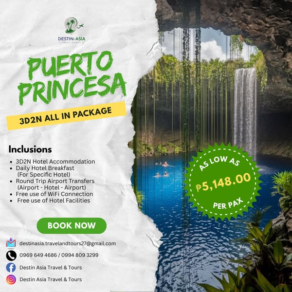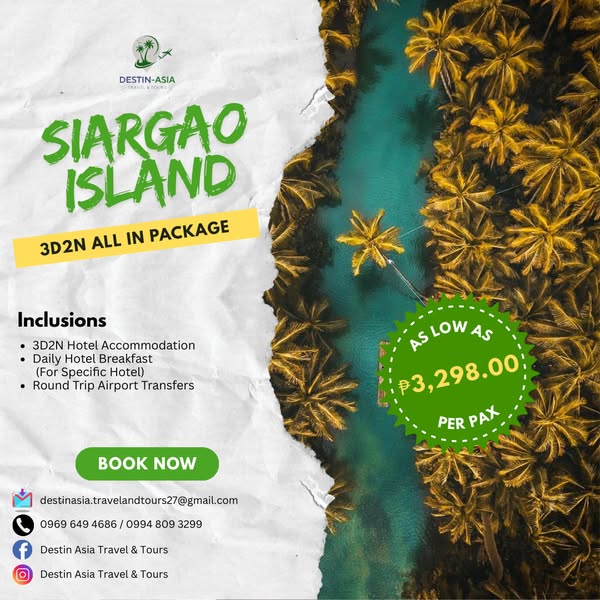 Explore the best of Asia with Destin Asia Travel and Tours! Offering expertly curated packages to stunning destinations: the surprisingly beauty of 𝗖𝗲𝗯𝘂, the stunning nature of 𝗕𝗮𝗻𝘁𝗮𝘆𝗮𝗻 𝗜𝘀𝗹𝗮𝗻𝗱, the amazing 𝗦𝗶𝗮𝗿𝗴𝗮𝗼 𝗜𝘀𝗹𝗮𝗻𝗱, and the memorable & eye-catching tourist spots of 𝗣𝘂𝗲𝗿𝘁𝗼 𝗣𝗿𝗶𝗻𝗰𝗲𝘀𝗮!