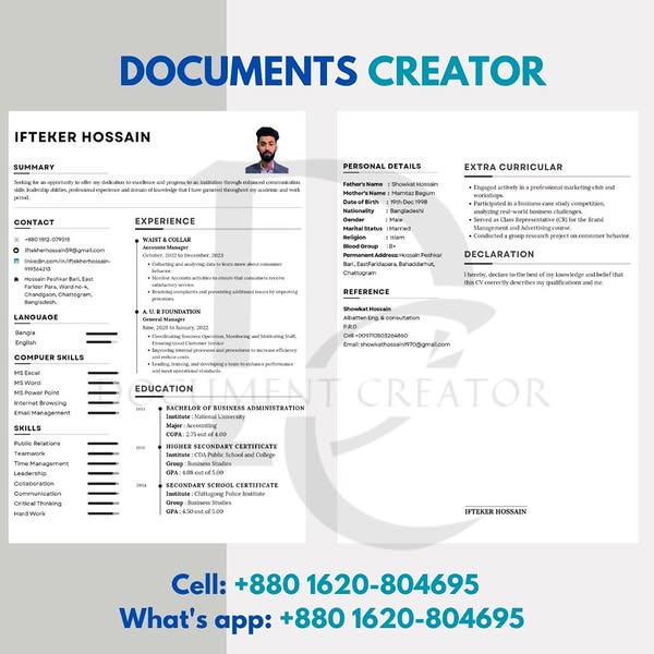 ➡ আজই বুকিং দিন একটি প্রফেশনাল সিভি কারন প্রফেশনাল সিভি বুকিং দিচ্ছেন মানেই কিন্তু আপনি হয়ে গেলেন একজন ফ্রন্টলাইনার। তাই আর দেরি না করে এখনি আমাদের মেসেজ করুন অথবা নিচে দেওয়া হোয়াটসঅ্যাপ নাম্বারে যোগাযোগ করুন।
