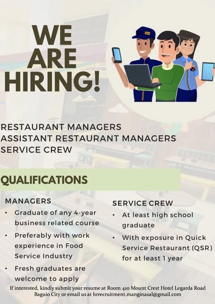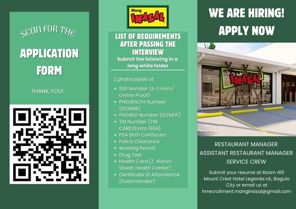 搜索关键词 Mang Inasal jobs, restaurant hiring, Baguio jobs, Philippines restaurant, service crew position, restaurant manager vacancy, food service careers, culinary job openings, hospitality employment, job seekers wanted优势 Multiple locations available,Clear job position listings,Easy application process (email and in-person)