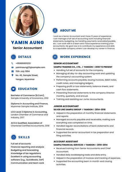 🔵 Are Written by Professionals: our writers have decades of experience going through thousands of CVs as Managers, Business Owners, and HR Recruiters in Myanmar and internationally. You can be assured that your CV is written professionally to international standards.