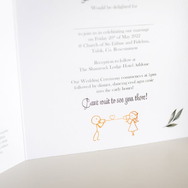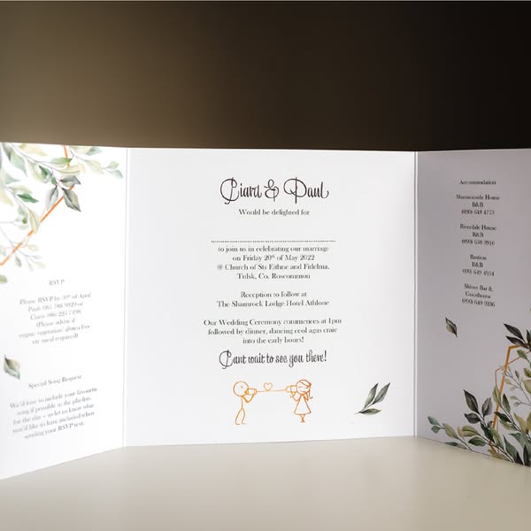 搜索关键词 wedding invitation, greenery design, June discount, irish business, wedding stationery, gold framing, wedding theme, wedding colors, invitation design, limited-time offer优势 Beautiful greenery design,Complementary gold framing,15% discount in June,Can be used throughout wedding stationery