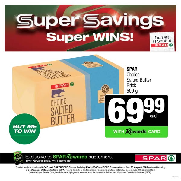 SUPER SAVINGS, SUPER WINS! 🎉💰 Shop at SPAR from 25 August - 7 September 2025 and enjoy amazing deals and discounts. Don't miss out on the chance to save big and win big! 🏆