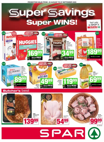 Super Savings are back at SPAR from 25 August up to and including 7 September 2025! 📅 Stock up and save BIG while stocks last! 🚨 Plus, win your share of R6 MILLION instant cash when you buy any 3 participating products! 💸