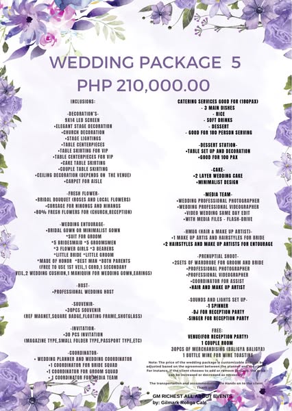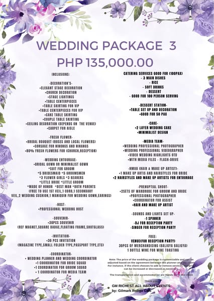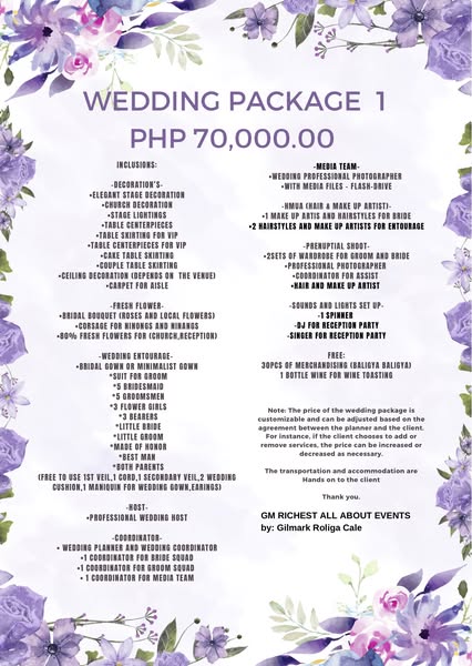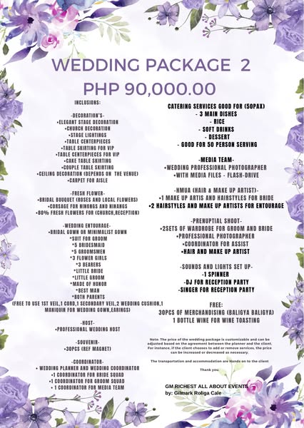 搜索关键词 wedding packages, event planning, dream weddings, wedding events philippines, simple to grand weddings, elegant wedding services, updated wedding packages, GM Richest All About Events, wedding celebration, future couples优势 Offers a range of wedding packages from simple to grand.,Committed to providing the best experience.,Updated packages to serve customers better.