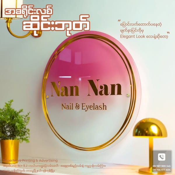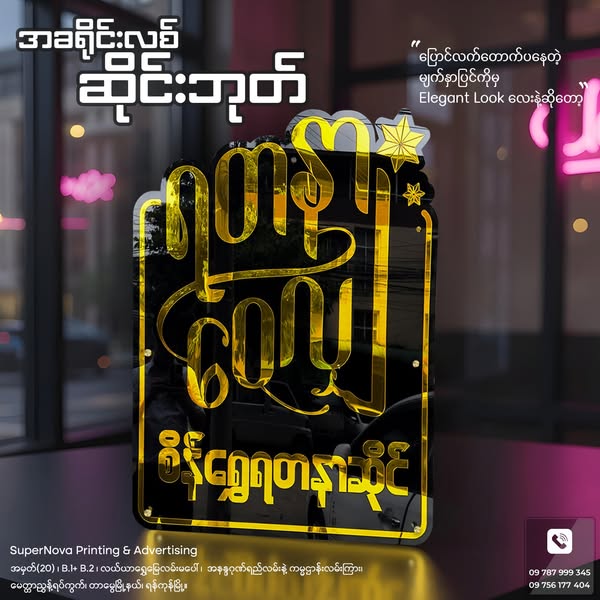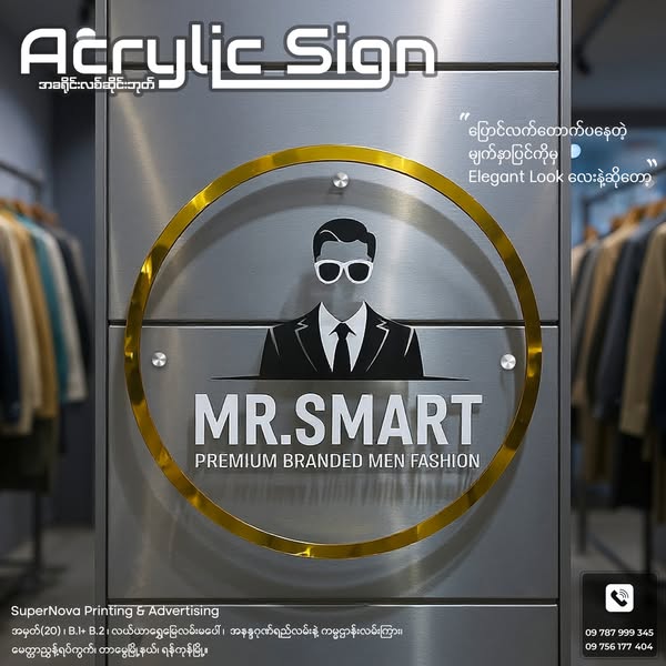 搜索关键词 acrylic sign, signage maker, Yangon printing, outdoor sign, indoor signage, advertising Myanmar, brand image, business signage, supernova printing, custom signage优势 Visually appealing and elegant design,Creates memorable impression,Suitable for photo booth backdrops,Projects a professional business image,Cost-effective luxury look