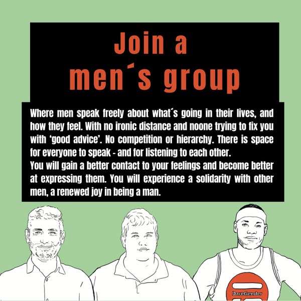 Are you ready to get to know your emotions better? And listen to what’s going on in the lives of other men? Sign up for DareGender’s free men’s groups now.