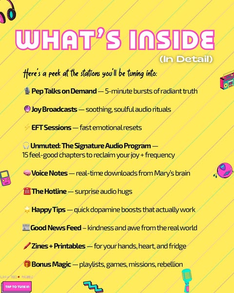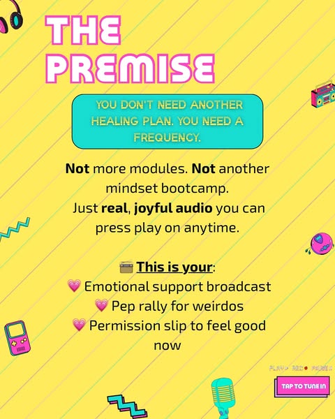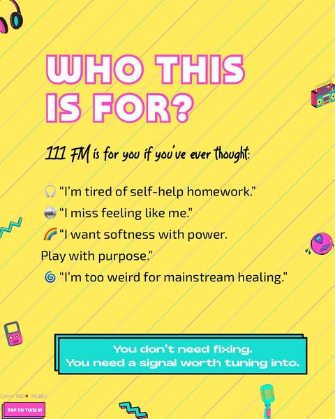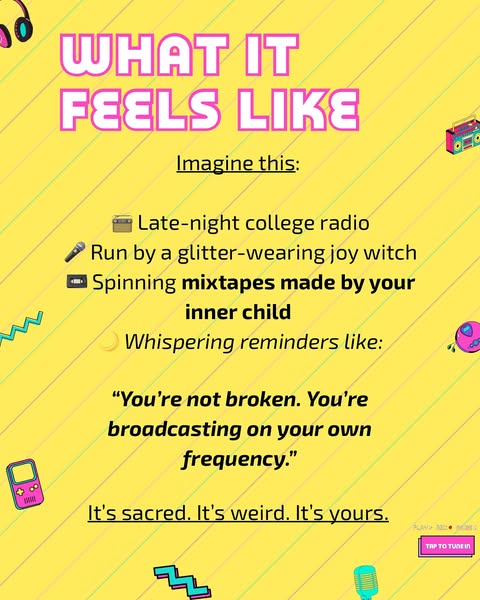 #MentalHealthMatters #SelfCareTools #PositiveVibesOnly #NervousSystemHealing #SelfLoveClub #FeelGoodContent #EmotionalWellness #InnerChildHealing #CreativeWellness #MindBodySoul #JoyBroadcast #SelfHelpRebellion #AlternativeHealing #TiredOfTheWork #JustFeelGood #SoftSelfHelp #WhimsicalWellness #UnmutedAndUnfiltered #PermissionToPlay #RadioForYourSoul
