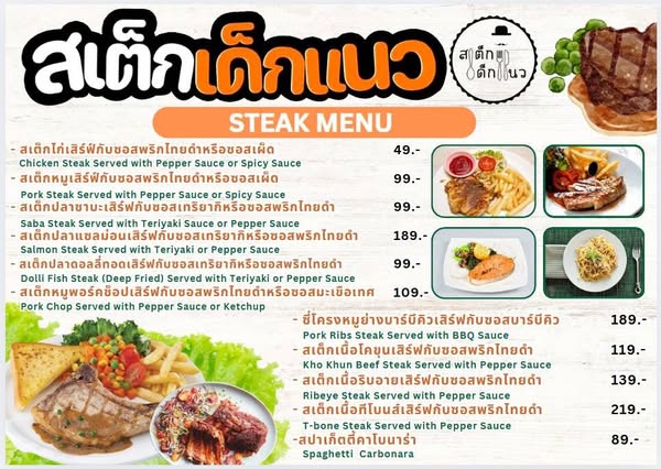 搜索关键词 Steak restaurant Cha-Am, Steak Dek Naew promotion, Cheap steak , Restaurant promotion, Restaurant near Ang Hin School, Food delivery Cha-Am, Local steak house优势 Large steak portions,Unique sauce,Free drink with Facebook post and check-in,Variety of menu items available