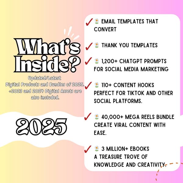 搜索关键词 digital products bundle, earn online, canva templates, social media content, midjourney prompts, plr guidebook, tiktok content, reels bundle, ebooks download, coloring books优势 Massive Bundle of Digital Assets,Low Introductory Price,Ready-to-use Templates and Resources,Potential for Resale and Earning