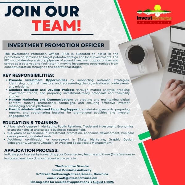📩 Apply now: Send your resume and cover letter to vwatt@investdominica.dm