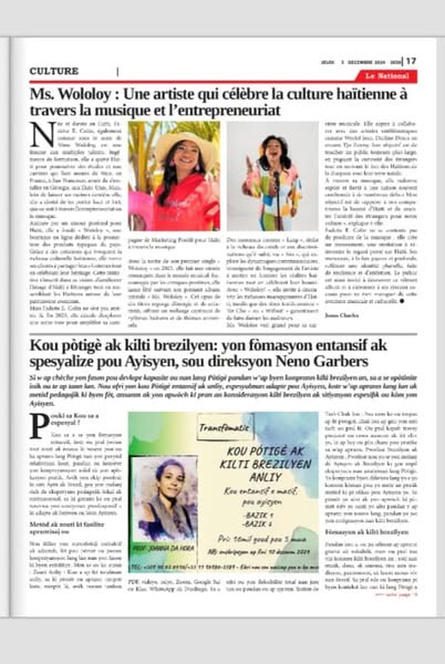 💃🏽🎶❤️ Hey! Jounal pa sou rad mwen sèlman non, mwen nan jounal tou wi 😃😍🇭🇹. Jounal "Le National", nan edisyon ki parèt semèn dènyè a, le 5 Desanm lan, ekri yon atik sou mwen nan seksyon kiltirèl la. Yo pale de mwen ak Kanpay Maketing Pozitif map fè pou Ayiti e yo mande pou moun ak lòt atis ki fè non yo deja pou yo swiv mwen ak sipòte mwen kòm on jèn atis ki ap pote yon bagay diferan e fre. A la bèl 🌹❤️, m ap pataje avèk nou 🫂💕.