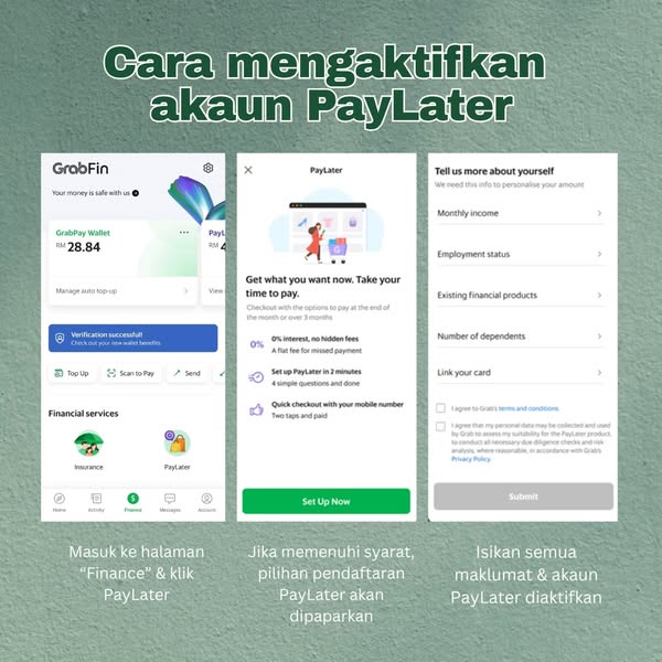 1️⃣ Aktifkan PayLater by Grab – buka Grab app > Finance > PayLater > Activate.