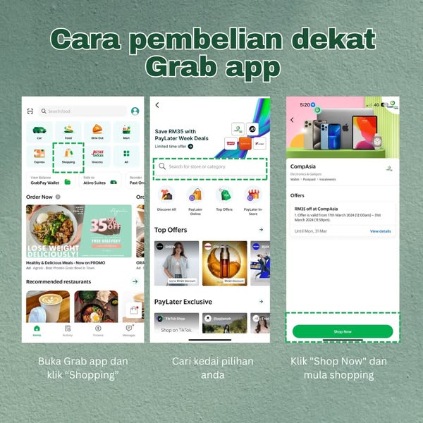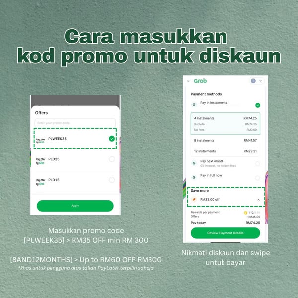 Jangan risau, sekarang tak perlu tunggu lagi gais!! Beli je apa yang korang nak dengan PayLater by Grab. Menerusi tawaran PayLater Week Deal, korang boleh enjoy DISKAUN RM35 bila berbelanja RM300 & ke atas dan bayar secara ansuran selama 4 bulan tanpa faedah! 🛍️ Masukkan kod masa buat pembayaran, terus dapat RM35 OFF on the spot tau! 🤩