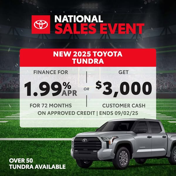 Finance APR Offer #1: Excludes TRD Pro. Terms available on approved credit for only very well-qualified customers through Toyota Financial Services (TFS). $14.75 per $1,000 financed. No down payment required if qualified. All prices plus government fees and taxes, any finance charges, a dealer document processing charge of $85, any electronic filing charge, any emission testing charge. Cannot be combined with other offers. Dealer participation may affect consumer cost. Expires 09/02/2025. Purchase Offer: $3,000 Customer Cash from Toyota Motor Sales U.S.A. From dealer’s stock and subject to vehicle availability. Cannot be combined with other offers. All prices plus government fees and taxes, any finance charges, a dealer document processing charge of $85, any electronic filing charge, any emission testing charge. Offer expires 09/02/2025.