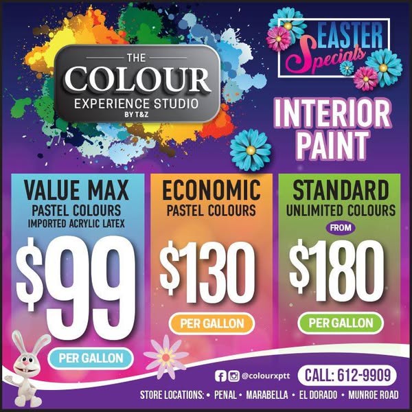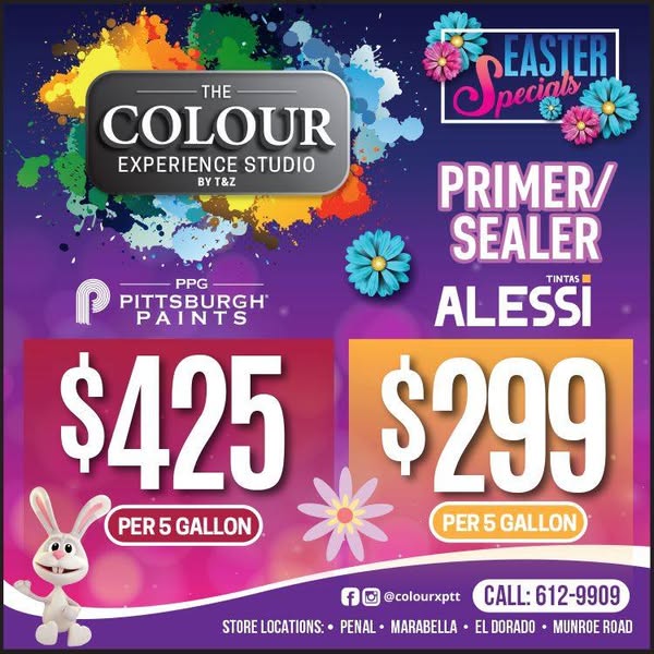 搜索关键词 Easter paint sale, paint blowout, cheap paints, vibrant home colors, home improvement paint, The Colour Experience Studio, sealer primer discount, limited time paint offer, paint deals Trinidad, Redefine How You Experience Colour优势 Wide variety of colors (2000+ shades),Discounted prices,Special offer on sealer primer,Multiple locations
