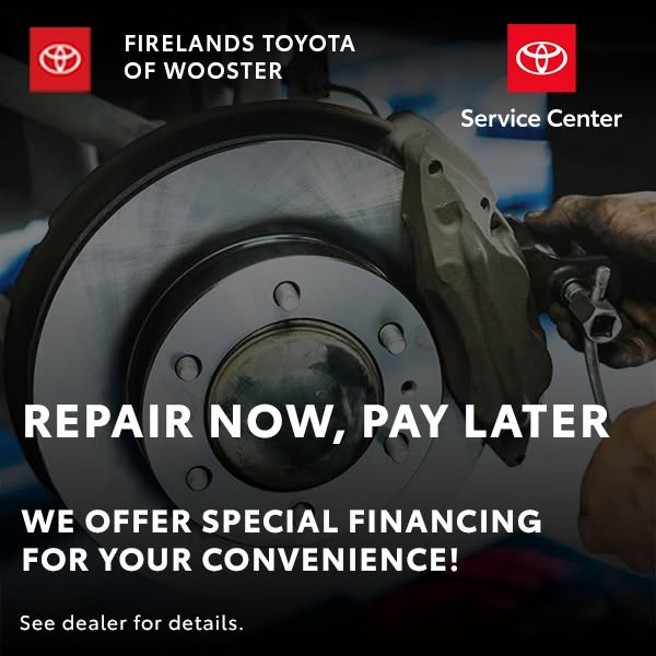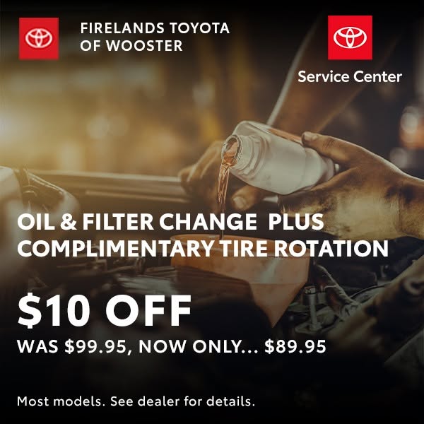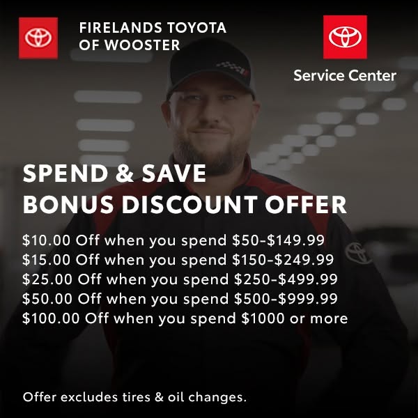 Most models. Discount is good on vehicle service (parts & labor) and is not valid toward any other advertised special. One coupon per work order. Discount will be taken off the regular posted price. Must present coupon when order is written. Plus tax & shop supplies. Not valid with any other offer. Prior sales excluded. Valid only at Firelands Toyota of Wooster.
