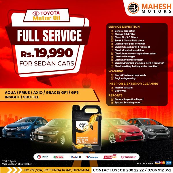 搜索关键词 Toyota service, Axio service, Allion service, Aqua service, Hybrid car service, Toyota motor oil, Vehicle maintenance, Car service offer, Sri Lanka car service, Mahesh Motors优势 Service offer for specific Toyota models,Use of Toyota Motor Oil,Credit card payments accepted,Location mentioned