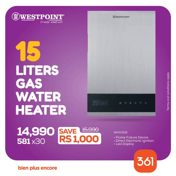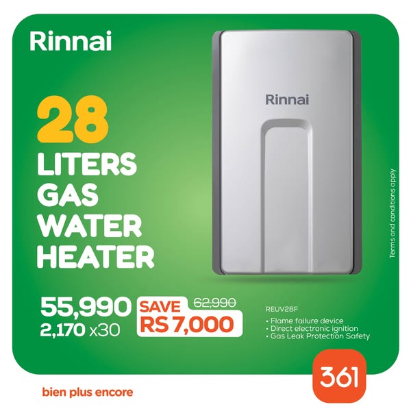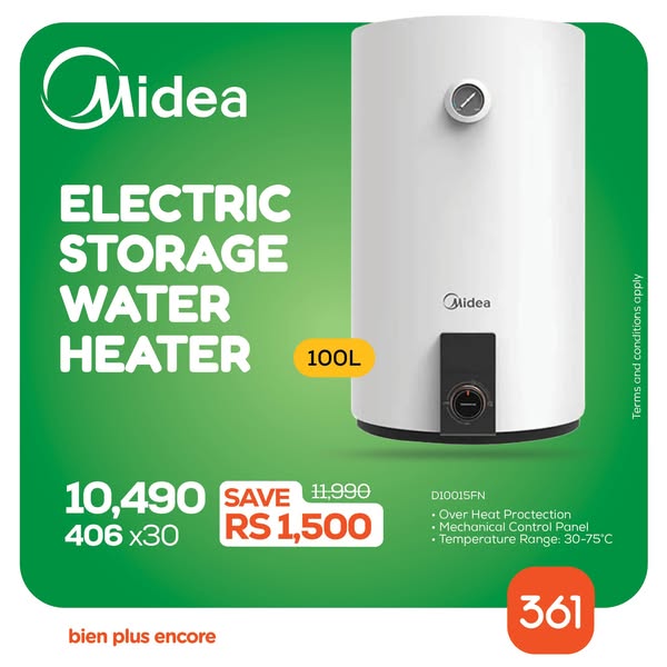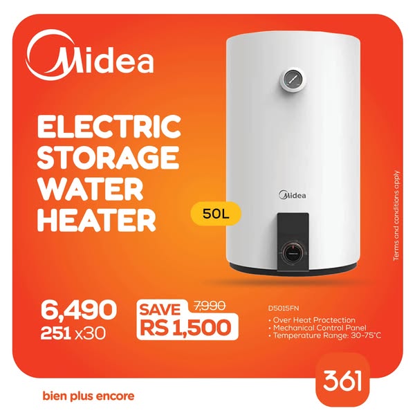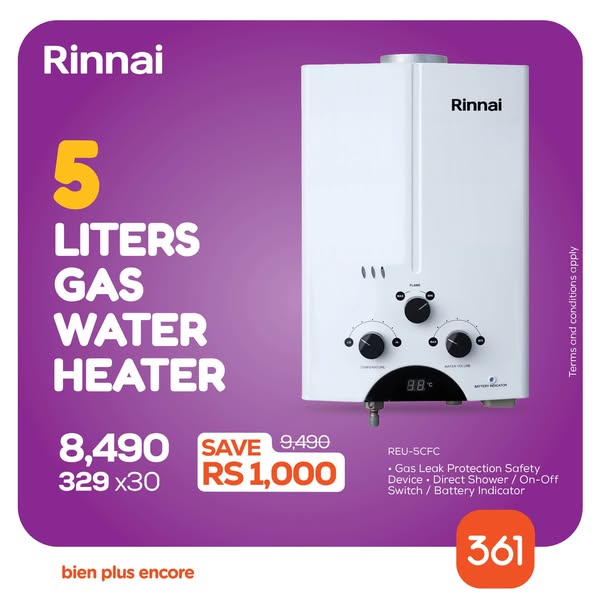 搜索关键词 Gas Water Heater, Electric Water Heater, Online Shopping, Credit Options, Zero Interest, Home Appliances, Rinnai Westpoint Midea, Hot Showers, Mauritius Offers, 361 Showroom优势 Multiple brands available,Online shopping,Credit options,Zero Interest option