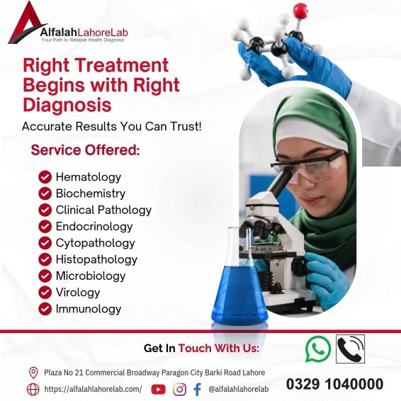 Right Treatment Begins with Right Diagnosis 🔬 Accurate Diagnosis for the Best Treatment! 🏥 At Alfalah Lahore Lab, we ensure precision, reliability, and trust in every test we conduct. With advanced diagnostic services in hematology, microbiology, endocrinology, virology, and more, we help you take charge of your health! ✅ 🏠 Home Sample Collection Available 📑 Timely & Accurate Reports 🧪 State-of-the-Art Pathology Services