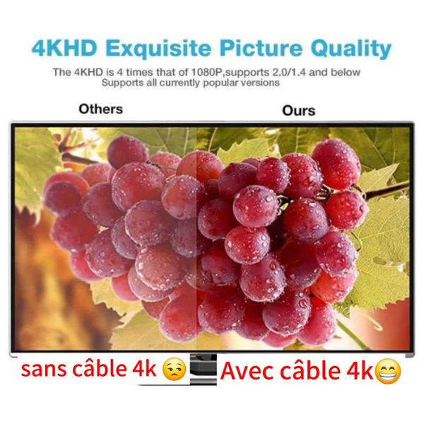 Le câble HMDI 4K haut débit prend en charge la 4K, la technologie Deep Color (destinée à améliorer le rendu des couleurs) et la 3D. Le débit d’un câble HDMI High Speed peut aller jusqu’à 10,2 Gbps, permettant de profiter d’une expérience Full HD (1 080p) de manière optimale. D’autres fonctionnalités sont prises en charge, comme la 4K@60Hz (pour une résolution de 4 096 x 2 160). Exactement comme au cinéma ! .