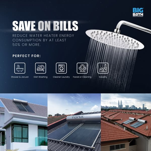 搜索关键词 solar water heater, energy saving, eco friendly, water heating costs, sustainable home, big bath malaysia, TORA solar, hot water system, landed homeowners, energy bills优势 Lower energy bills,Eco-friendly design,Durable marine-grade stainless steel tanks,Significant energy savings (at least 50%),Rapid heating with larger collector panels