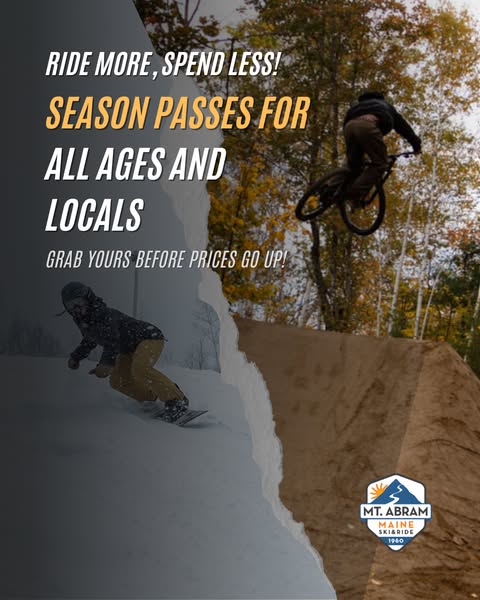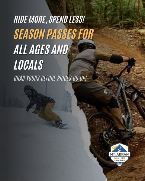 Why choose one season when you can have it ALL? 🙌 The Mt. Abram Combo Pass gives you unlimited mountain biking this Summer 2025 AND unlimited skiing/snowboarding for the entire Winter 2025/2026 season! It's the ultimate pass for year-round mountain adventurers. Lock in the best value now!