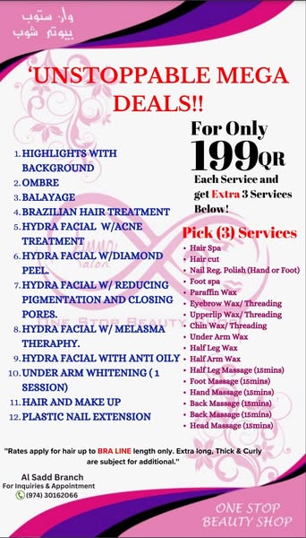 Starting at ONLY QAR 120 QR you’ll get to pay ONLY one major service and get 1 or 3 more services absolutely for FREE!!