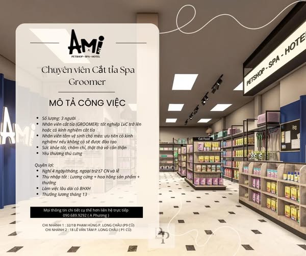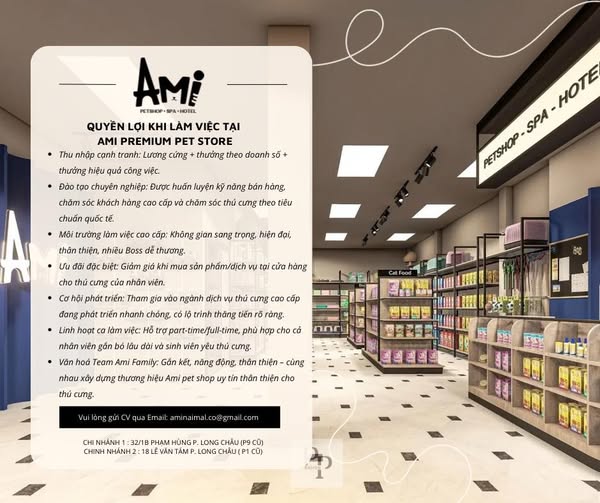 📩 Ứng tuyển ngay hôm nay để cùng Ami xây dựng trải nghiệm mua sắm thú cưng cao cấp hàng đầu tại Vĩnh Long! 👉 Vui lòng gửi CV ngay cho chúng tôi tại 2 chi nhánh hoặc amianimal.co@gmail.com