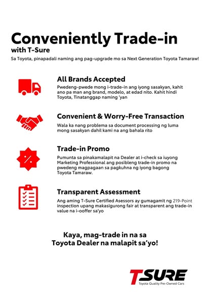 搜索关键词 Toyota Tamaraw, Car Promo, Philippines, Vehicle Trade-in, Car Registration, Auto Insurance, Filipino Made, Commercial Vehicle, Toyota Matina, New Car Offers优势 Free comprehensive insurance,Free 3 years LTO registration,Free chattel mortgage,Free tint, seat cover, floor matting,Trade-in accepted for all brands