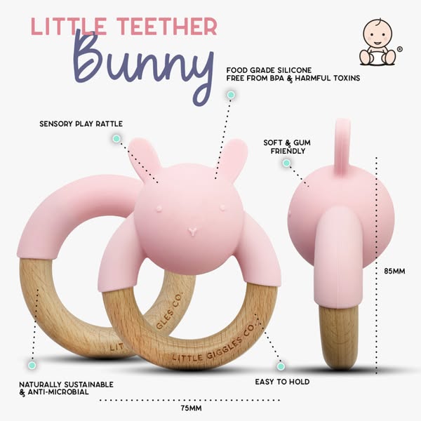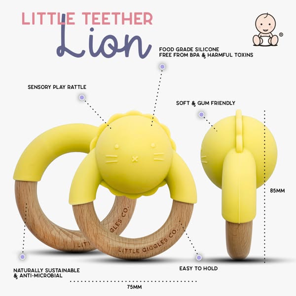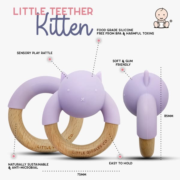 The set includes a thoughtfully designed, super simple, lightweight teething ring, easy to hold for any early teether and a cute kitten character sensory rattle for soothing and stimulation.