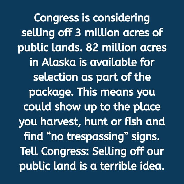 Senator Mike Lee (R- Utah) is trying to privatize public land in Alaska. The language keeps changing as he tries to shoehorn the sale of our lands into the budget bill. This isn't over. Tell our Congressional delegation: Alaska's public land is not for sale.