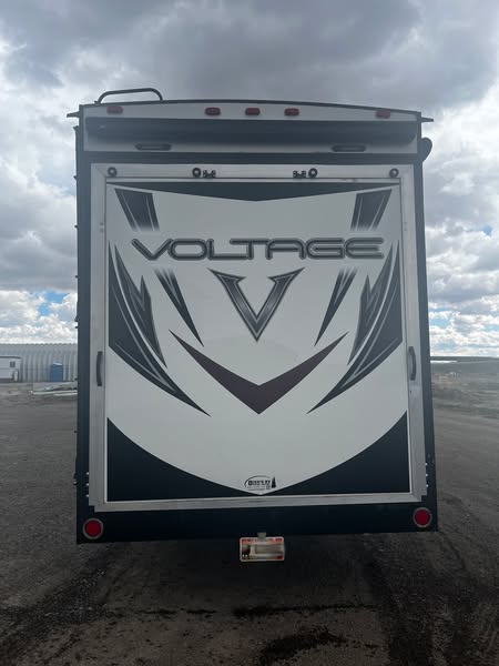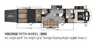 With this Dutchmen Voltage fifth wheel toy hauler, you can easily have fun inside, as well as outside with the toys you bring along. Model 3805 offers a 14' garage space, triple slides, and one and a half baths, plus much more!