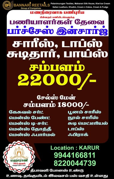 搜索关键词 job openings, karur jobs, food accommodation, immediate appointment, hr manager, chef jobs, technician jobs, safety officer jobs, receptionist jobs, delivery staff优势 Immediate Appointment,Free Food and Accommodation,Wide Range of Job Roles
