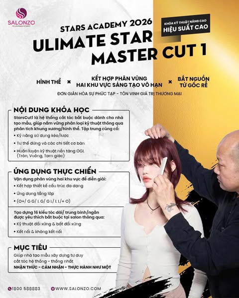 搜索关键词 hair cutting workshop, hairdressing training, salon techniques, Lưu Hữu Tinh, hair expert, Asia hairstylist, modern hair form, salonzo academy, OGL hair, Star Master Cut优势 Taught by leading Asian hair expert,Focus on practical skills and modern techniques,Limited class size for personalized attention,Includes certificate and additional training opportunities