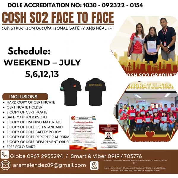 搜索关键词 safety officer training, first aid certification, PCAB license assistance, construction safety seminar, BOSH training, COSH training, contractor license application, safety training Philippines, occupational safety training, emergency first aid优势 Comprehensive Safety Training Programs (BOSH, COSH, First Aid),Assistance with PCAB License Application and Renewal,In-House Seminars Available for Companies,Complete range of PCAB assistance