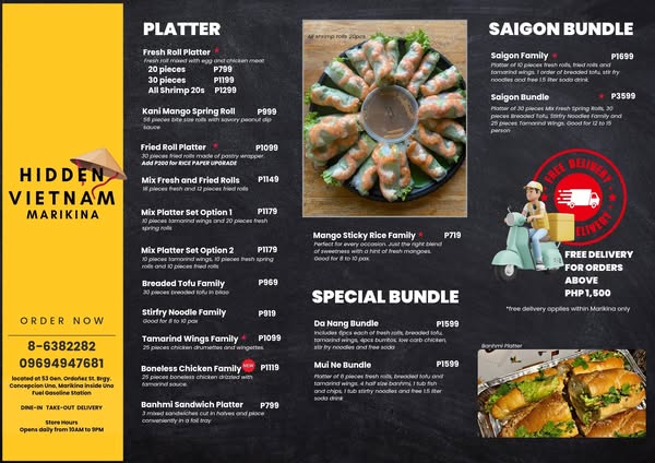 搜索关键词 vietnamese food marikina, pho delivery, banh mi philippines, spring rolls catering, hidden vietnam restaurant, marikina foodie, vietnamese cuisine, party food marikina, foodpanda grabfood, best vietnamese coffee优势 Freshly prepared dishes,Variety of Vietnamese cuisine (Bahn Mi, Pho, Spring Rolls),Options for dine-in, delivery, and catering,Convenient location with Google Map/Waze directions,Available on Foodpanda and Grabfood
