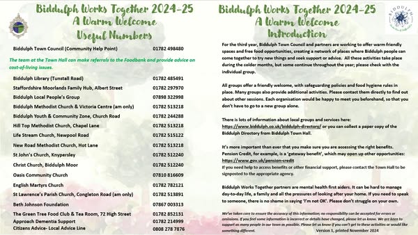 搜索关键词 Biddulph community support, free food Biddulph, social isolation help, Biddulph Works Together, warm spaces Biddulph, community partnership Staffordshire, Biddulph Town Council, winter support program, loneliness support, local community activities优势 Warm spaces,Free food,Support with social isolation and loneliness,Positive community partnership