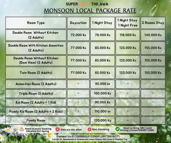 🤗𝟐𝟒𝐡𝐫𝐬 𝐄𝐥𝐞𝐜𝐭𝐫𝐢𝐜𝐢𝐭𝐲 & 𝐖𝐢𝐟𝐢 ရတာမို့ မိုးအေးအေးမှာ ရေမီးအစုံနဲ့ လေထီးခုန်ပြီးသာ 𝐒𝐮𝐩𝐞𝐫 𝐇𝐨𝐭𝐞𝐥 𝐓𝐡𝐢𝐥𝐚𝐰𝐚 ကိုလာခဲ့လိုက်တော့နော်