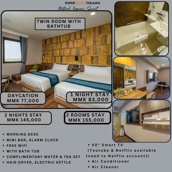 搜索关键词 hotel in Yangon, staycation Myanmar, Thilawa hotel, hot spring resort, Myanmar travel, Japanese style hotel, hotel promotion, family room, group travel, super hotel优势 Close to Yangon,Spacious and Quiet Environment,Activities Available,24-hour Electricity,Various Room Options,Hot Spring Access,Discounts on Spa Services,Birthday Discounts,Free Night Promotions,Offers on Daycations and Kid Rooms