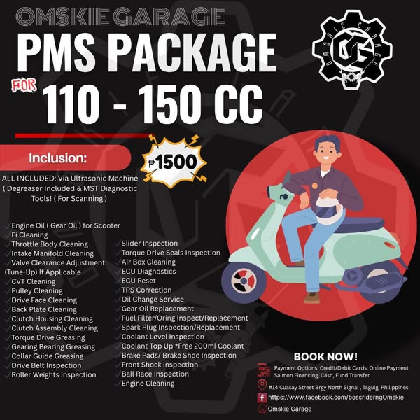 搜索关键词 scooter maintenance service, preventive maintenance, scooter repair, Taguig Philippines, motorcycle service, Cvt Cleaning, scooter electrical troubleshooting优势 Comprehensive maintenance package,Accepts multiple payment methods (Cash, Credit/Debit card, Online Payment),Offers various other services (repair, paint, tire, etc.),Long operating hours,Offers installment via Salmon Financing